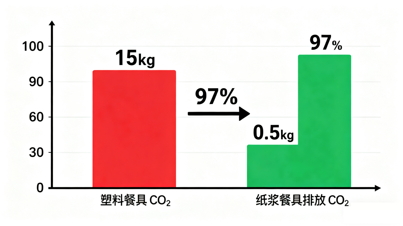 原料革命实现碳足迹锐减。与塑料餐具依赖石油提炼不同,纸浆模塑以植物纤维为基础,其中甘蔗渣餐具堪称典范 —— 每公斤生产仅排放 0.5kg CO₂,较塑料餐具的 15kg 降低 97%,全生命周期碳足迹仅为塑料的 1/5。